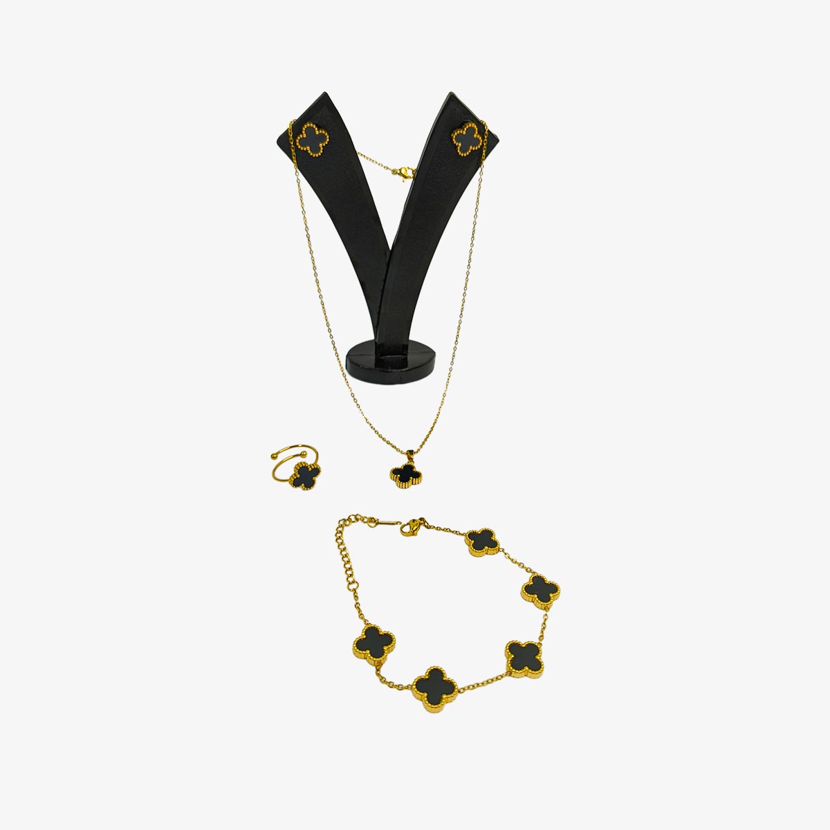 The Black Bloom Grace Set is a stunning blend of elegance and charm, designed to add a touch of sophistication to any look. This beautifully crafted set features a delicate gold chain necklace adorned with a black clover-shaped pendant, a matching bracelet with multiple black clover charms, and a stylish adjustable ring.