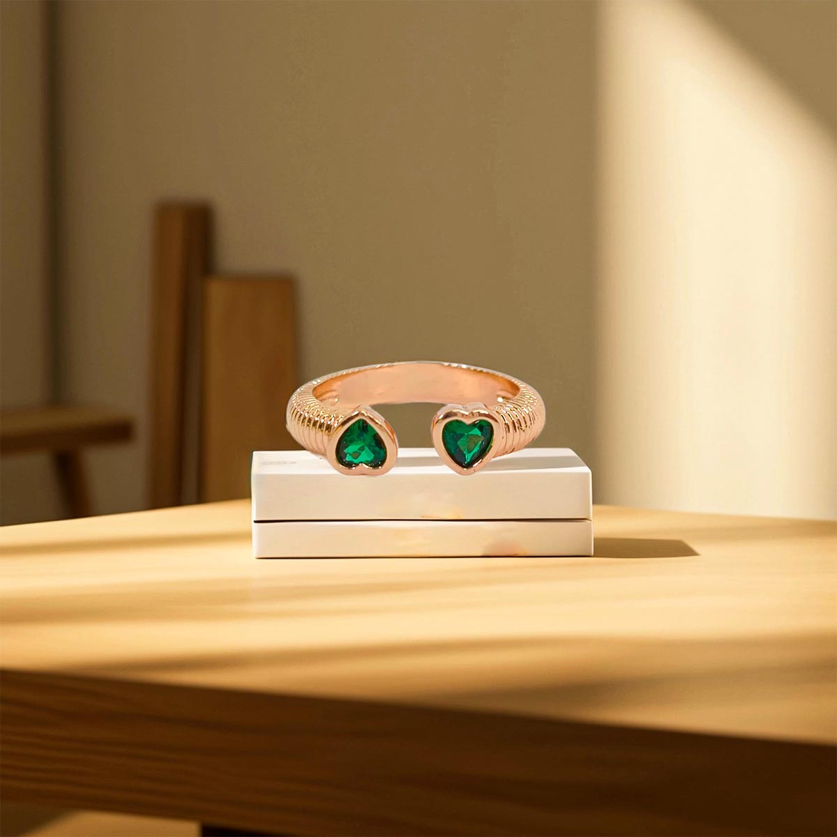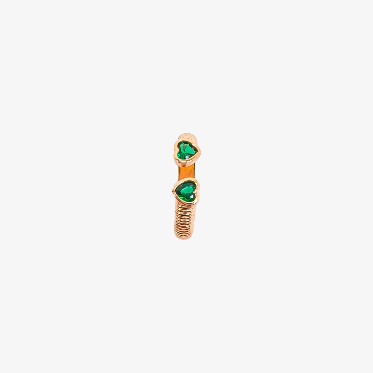 This exquisite gold-toned ring set is a perfect blend of elegance and playfulness. Featuring heart-shaped, emerald-green stones set in a sleek, open-ended design, these rings offer a unique and modern twist on classic jewelry. The intricate gold band details add texture and refinement, making this set ideal for everyday wear or special occasions.