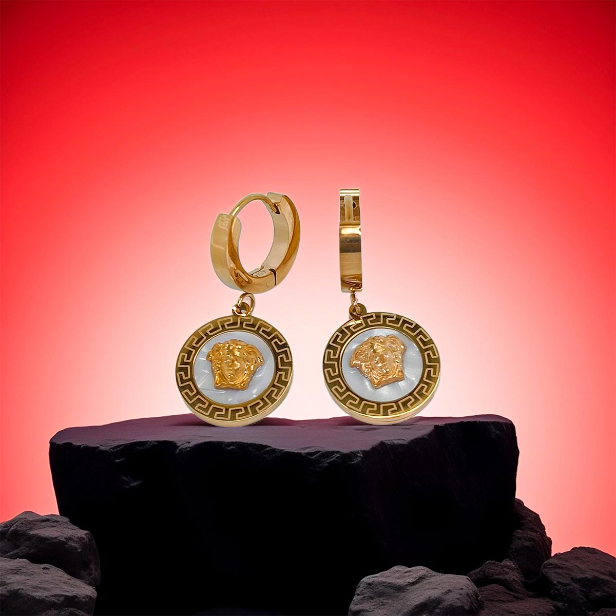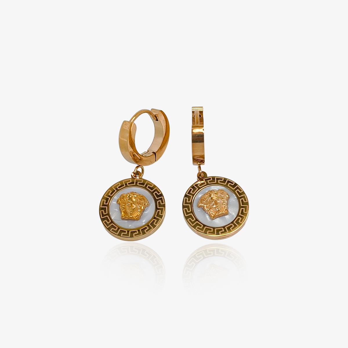These stunning gold-tone hoop earrings are a perfect blend of elegance and bold design. Featuring intricately crafted medallion drops, each earring showcases a beautifully detailed lion head motif, symbolizing strength and grace. The medallions are framed with a classic Greek key pattern, adding a touch of timeless sophistication. The smooth enamel background enhances the rich gold detailing, making these earrings a statement accessory.