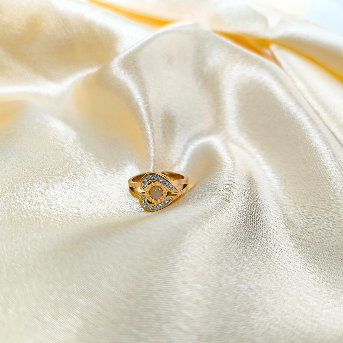 This captivating and stylish ring brings a perfect blend of modern design and timeless elegance. Featuring a distinctive spinning charm at its center, this piece stands out with its creative and playful touch. The charm is encircled by a row of shimmering stones, adding a refined sparkle that complements its sleek finish.
