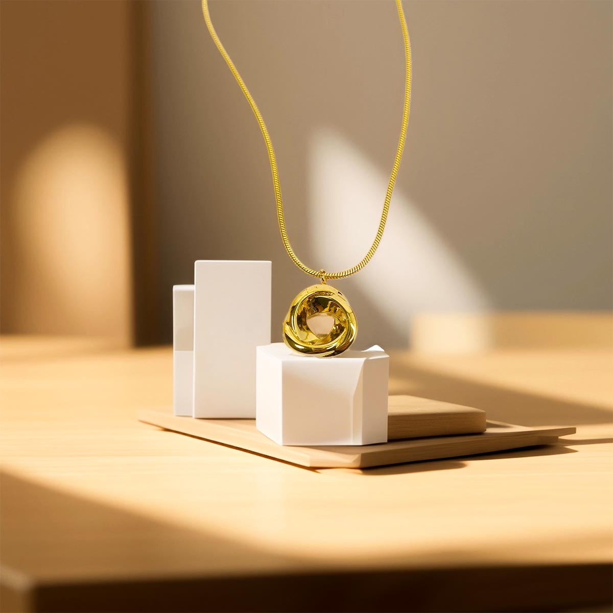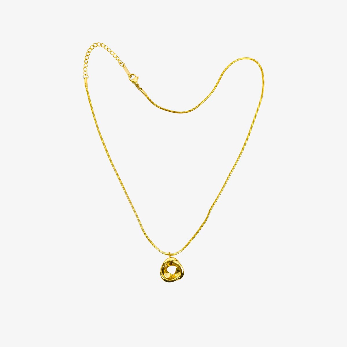 This exquisite gold pendant features a beautifully twisted, abstract design that captures light from every angle, creating a radiant and sophisticated look. Suspended on a delicate gold chain, this timeless piece combines modern artistry with classic elegance, making it perfect for any occasion. Whether worn alone for a subtle statement or layered with other pieces, this pendant adds a touch of charm and refinement to your jewelry collection.